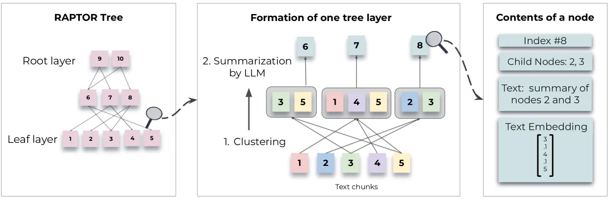 RAPTOR recursively clusters chunks of text based on their vector embeddings and generates text summaries of those clusters, constructing a tree from the bottom up. Nodes clustered together are siblings; a parent node contains the text summary of that cluster.