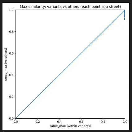 Finding: The diagonal (y = x) represents cases where "same street variants" and "different streets" have equal similarity → CLIP fails to distinguish between street names.