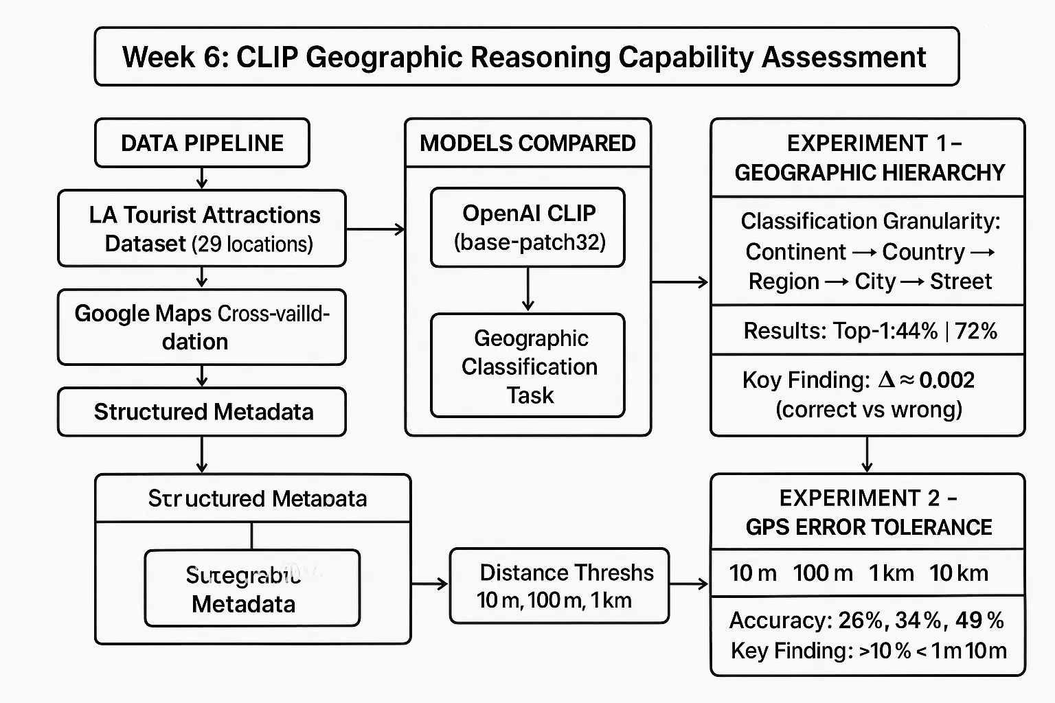 In this week, I investigated the geographic reasoning capability of pretrained vision-language models (VLMs) by assessing their ability to classify visual scenes at varying geographic granularities—continent, country, region, city, and street. Using a dataset of 29 tourist attractions in Los Angeles, we construct a structured metadata pipeline through GPT-based hierarchical labeling, Google Maps cross-validation, and GPS annotation. Two CLIP variants—openai/clip-vit-base-patch32 and laion/CLIP-ViT-H-14-laion2B-s32B-b79K—were compared to evaluate geospatial sensitivity. Results show moderate performance at street-level classification (Top-1 = 0.44, Top-5 = 0.72), revealing that CLIP captures the general “Los Angeles street” context but struggles with fine-grained distinctions among visually similar urban scenes. Cosine similarity distributions between correct and incorrect predictions were nearly overlapping (mean Δ ≈ 0.002), indicating weak discriminability at high resolution. Street name variant analysis further showed small embedding gaps (~0.02–0.05) between same and different street names, suggesting linguistic dilution of location-specific semantics. Additionally, experiments comparing textual addresses and GPS coordinates demonstrated that CLIP models align better with natural language address expressions (mean similarity ≈ 0.22) than with numerical coordinate strings (≈ 0.08–0.13). These findings highlight CLIP’s limitations in fine-grained geolocation and underscore the need for geospatially aware model architectures such as GeoCLIP. Future work includes exploring coordinate ambiguity effects and evaluating negation-aware location reasoning for robust geographic verification.
