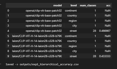 Objective: Following the methodology of Weyand et al. "PlaNet: Photo Geolocation with Convolutional Neural Networks" (NeurIPS 2023), assess the accuracy of existing pretrained open-source CLIP models across geographic hierarchies: Continent / Country / Region / City / Street.