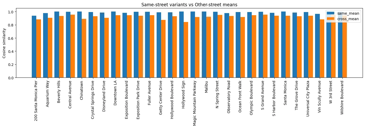 → The linguistic distinction between specific street names is weak; instead, the model strongly reflects the broader contextual concept of “Los Angeles street.”