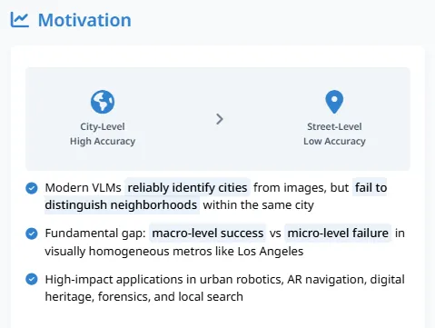 Recent advances in image geolocation show that modern models can reliably determine city-level locations from a single image. However, experimental evidence and prior work consistently demonstrate that intra-city street-level localization remains extremely challenging. Even state-of-the-art vision–language models (VLMs), which achieve strong performance at high-level geolocation (e.g., LA vs. SF vs. NYC), exhibit substantial confusion when distinguishing neighborhoods or street segments within the same city.