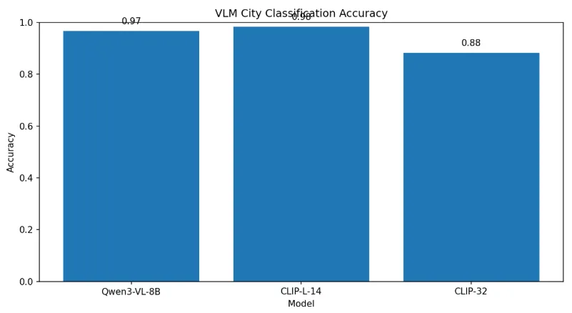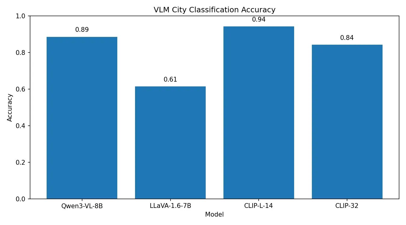 Tested VLMs (Qwen3-VL, LLaVA-1.6) and CLIP models on a small dataset of 67 landmark images from Los Angeles, San Francisco, and New York City