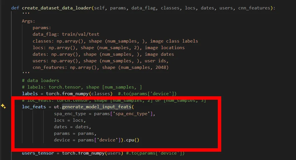 Spatial Encoder Integration: Uses a spatial encoder (spa_enc) to transform 2D location coordinates into high-dimensional embeddings