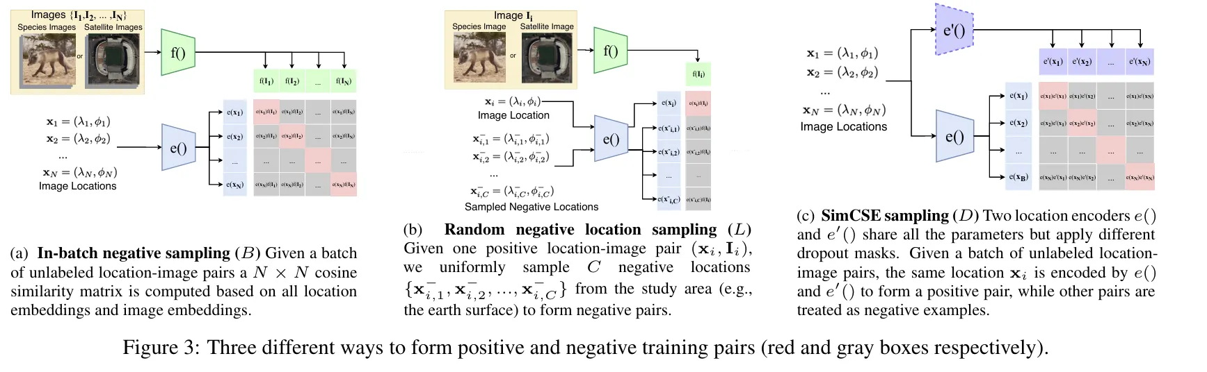 Uses other samples within the same batch as negative examples. This is computationally efficient but may suffer from false negatives when batch samples are geographically close.