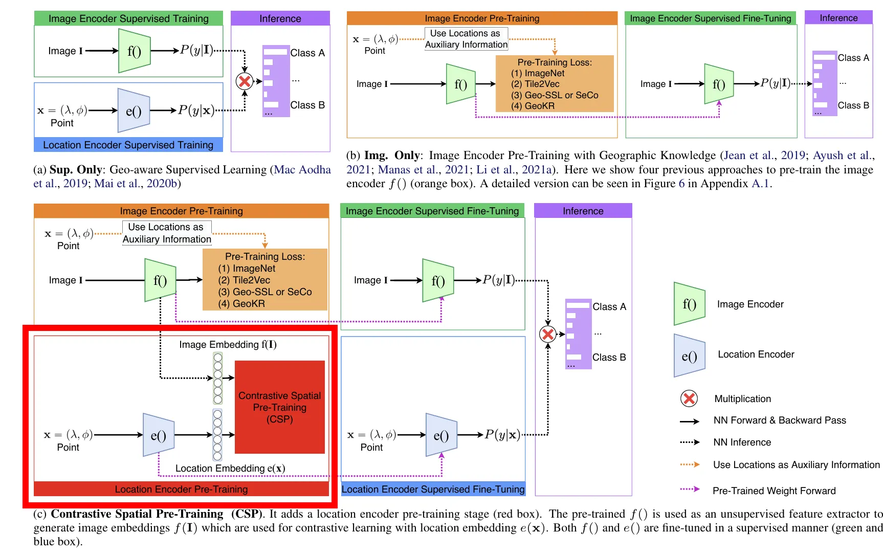 Contrastive Spatial Pre-Training: A label-free self-supervised learning phase that aligns location encoder e(x) and image encoder f(I) in a geospatially aligned representation space.