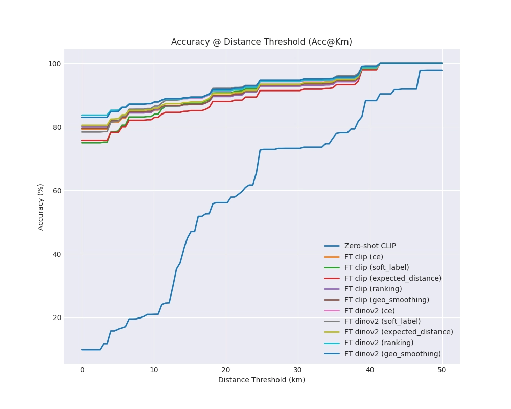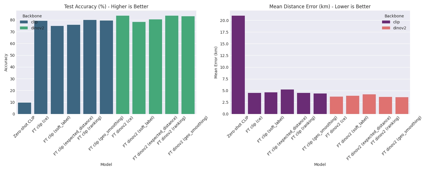 Experimental results show that DINOv2 consistently outperforms CLIP by 3–5% accuracy across all settings. Moreover, distance-aware losses—especially Geo-Margin Ranking Loss and Geo Label Smoothing—significantly reduce mean geolocation error compared to standard classification loss. The best-performing model (FT DINOv2 + Ranking Loss) achieves 83.70% accuracy with a mean error of 3.64 km