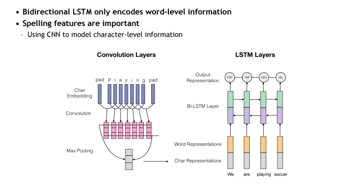 Character-level CNNs combined with BiLSTMs improve representation by capturing morphological features.