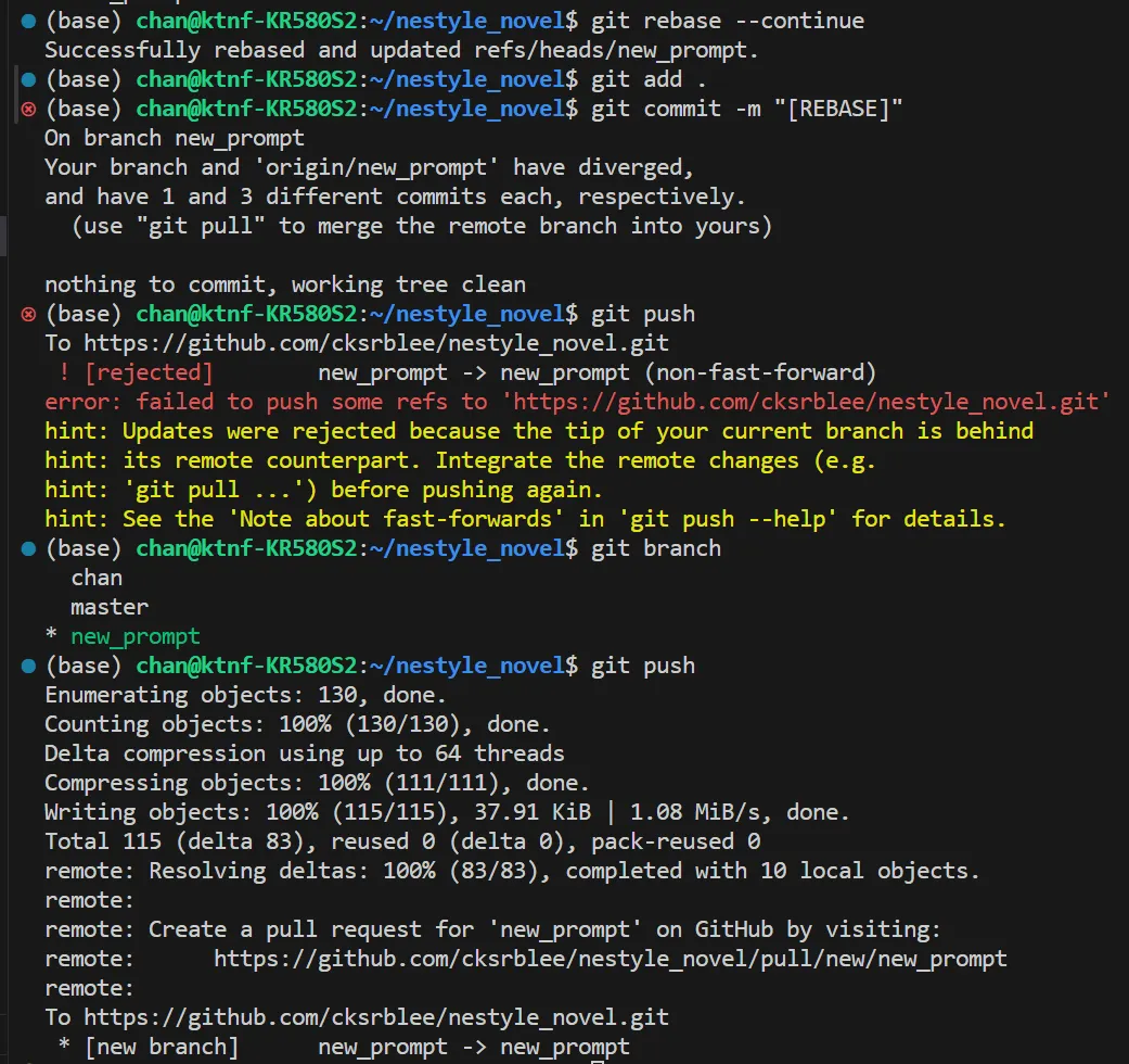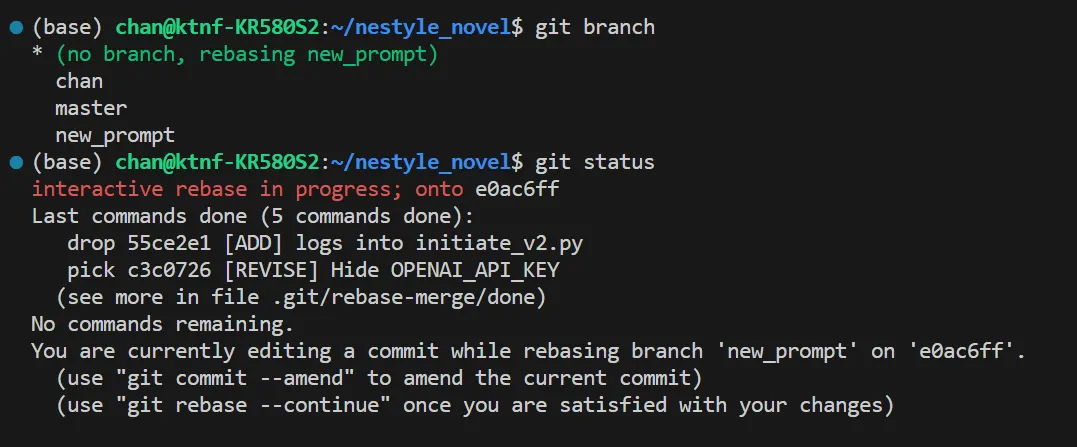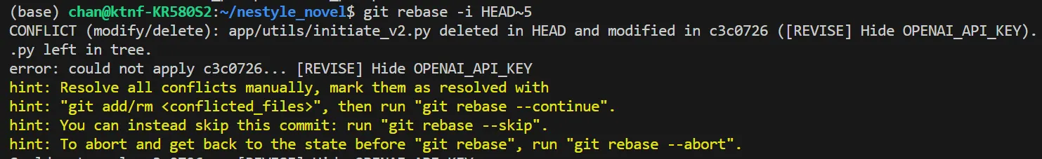 삭제 이후 git rebase --continue 를 입력하고 난 뒤 다시 커밋 진행