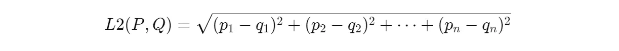 Euclidean Distance (a.k.a. L2 Distance) : The straight-line distance between two points in the vector space. It's intuitive but might not always capture the true semantic similarity for high-dimensional data.