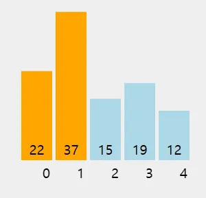두 번째 요소 (37): 이미 정렬된 부분 [22]와 비교한다. 37은 22보다 크기 때문에 자신의 자리에 그대로 유지한다. 배열 상태는 [22, 37, 15, 19, 12]가 된다.