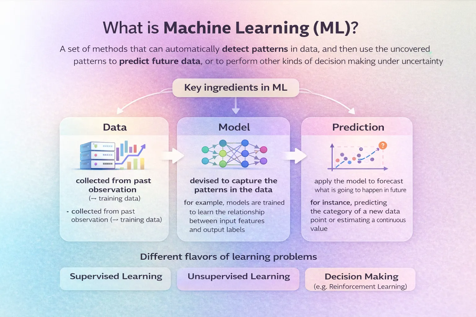 A set of methods that can automatically detect patterns in data, and then use the uncovered patterns to predict future data, or to perform other kinds of decision making under uncertainty