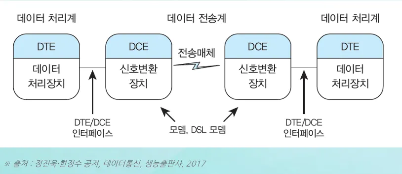 데이터 통신장비(DCE: Data Communication Equipment) : DTE와 데이터 전송로 사이에서 접속을 설정, 유지, 해제하며, 부호 변환과 신호 변환을 위한 기능 제공