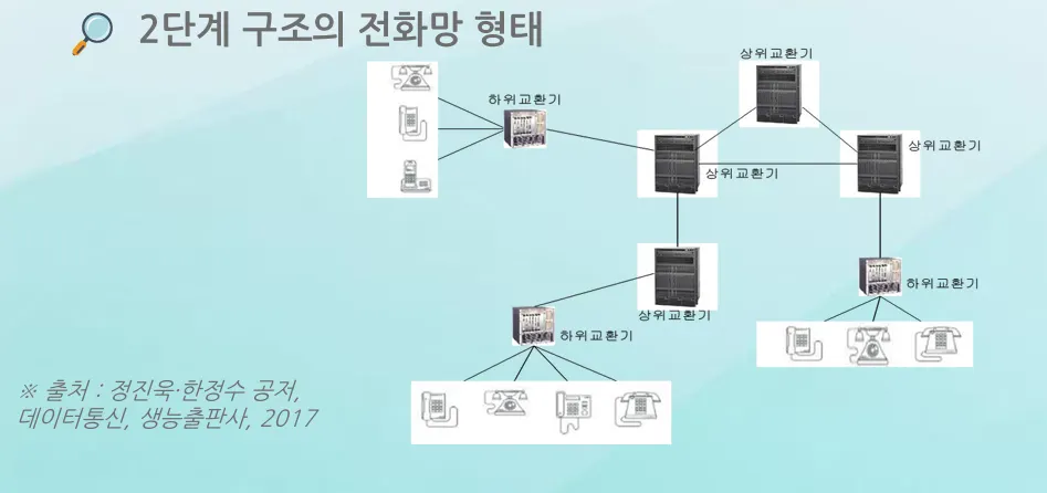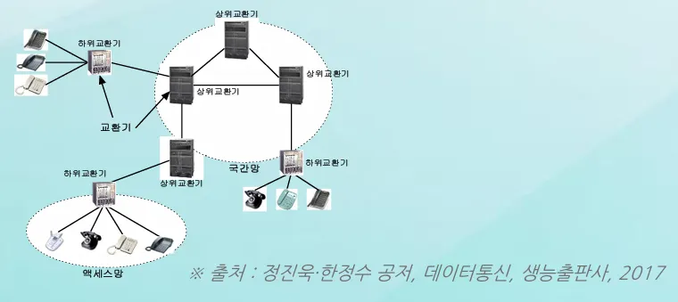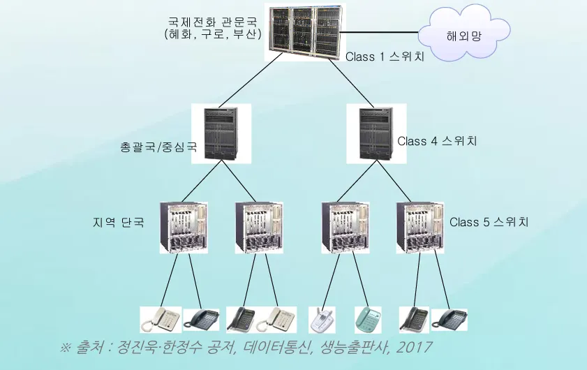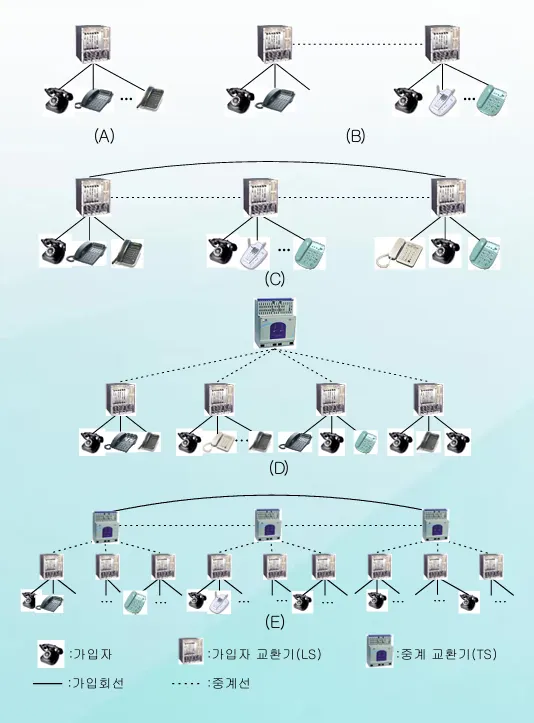 교환기를 계층적으로 구성하여, 전화기의 증가로 많은 교환기 필요