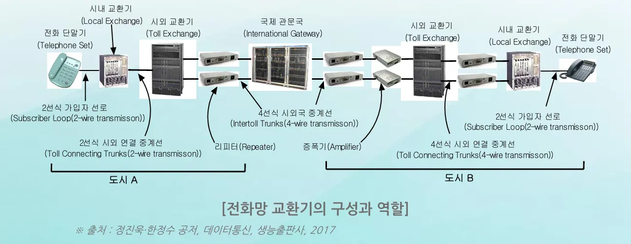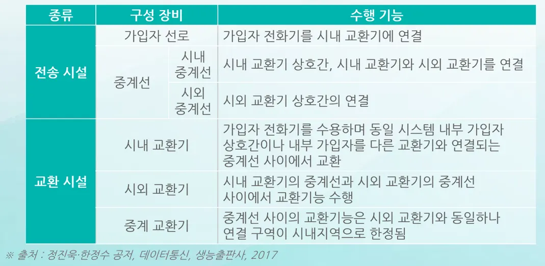 교환시설: 시내교환기, 시외교환기, 중계교환기, 국제관문국