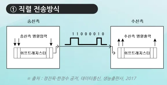 직렬: 한번에 한 비트씩 순서대로 데이터 전송