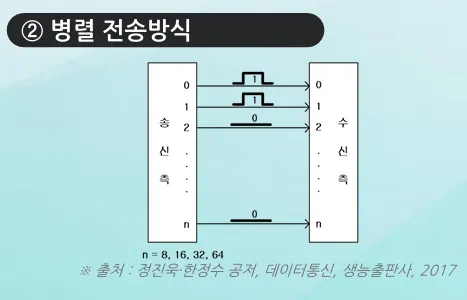 병렬: 여러 개의 비트를 그룹으로 한번에 전송
