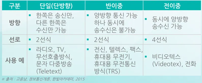 단방향: 데이터가 전송로에서 한 방향으로만 데이터가 흐르는 방식